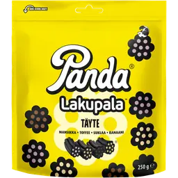 sokeri, sokerisiirappi, VEHNÄJAUHO, glukoosisiirappi, glukoosi-fruktoosisiirappi, lakritsiuute (alkuperä: muu kuin EU), liivate, kosteudensäilyttäjä (glyseroli), kokonaan kovetettu kasvirasva (kookos), väri (kasvihiili), aromi, säilöntäaine (kaliumsorbaatti), pintakäsittelyaine (karnaubavaha).